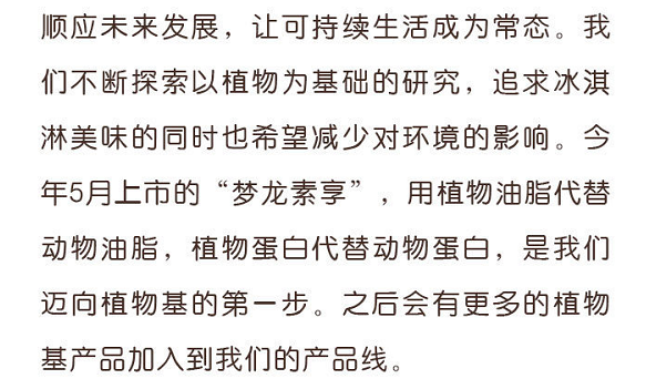 不过,梦龙的这一回复并不算是一次成功的公关。梦龙在回应中同时提到,今年5月上市的“梦龙素享”,用植物油脂代替动物油脂,植物蛋白代替动物蛋白,之后会有更多的植物基产品加入到产品线。