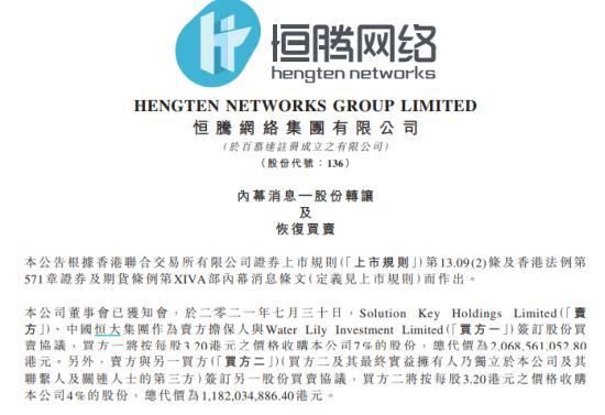8月1日晚,港股上市公司恒腾网络公告称,中国恒大方面拟出让公司11%股权,合计作价32.5亿港元。其中,公司股东腾讯拟以20.69亿港元接下7%。