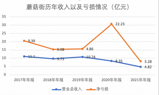 2017-2019财年,蘑菇街的总营收分别为11.1亿元、9.73亿元、10.74亿元,但自从2019年决定“all in直播”之后,蘑菇街的总营收便开始大幅下降,2021财年同比下降42.28%,其中佣金收入减少27.3%至3.186亿元,广告收入减少70.6%至7135万元,从下图中可以看到,同期亏损情况也在收窄。