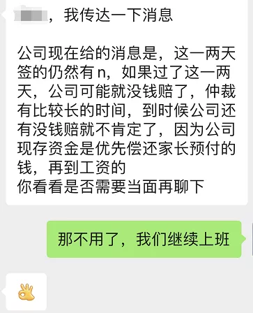 打算对抗到底的多数员工还是没有理会。8月2日周一上班,豌豆思维的公司副总裁出面与员工接洽。“向员工面谈打感情牌,劝我们最好不要当‘刺头’。”蓝斐称,为了催促大家尽快签字,公司说只能给这两天签的人赔偿N,“因为账户上的钱会优先处理家长退费,其次才是员工工资,越到后面账户越没钱。”