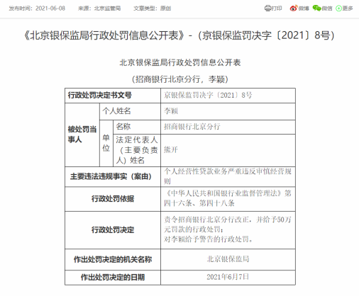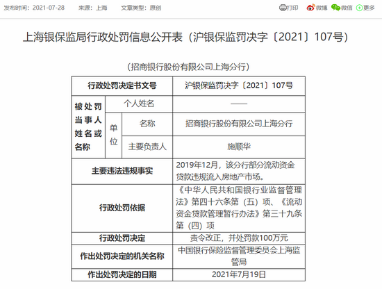 就在上周,7月28日,中国银保监会上海监管局发布公告,招商银行上海分行存在贷款违规流入房地产市场的违规行为,上海监管局对其作出罚款人民币100万元的行政处罚决定。