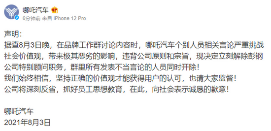 据查8月3日晚,在品牌工作群讨论内容时,哪吒汽车个别人员相关言论严重挑战社会价值观,带来极其恶劣的影响,违背公司原则和宗旨,现决定立刻解除彭钢公司特别顾问职务,群里所有发表不当言论的人员同时开除!