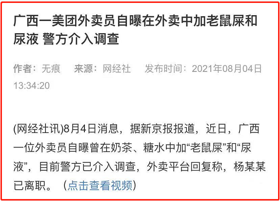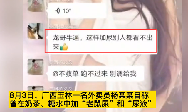 炣燃科技8月4日讯(江丞华 李琳)“ 我加什么他们就吃什么,任由我摆弄!”8月3日,广西玉林一名外卖员杨某某在微信群中自曝,经常在外卖中加入“老鼠屎”和“尿液”,进而引发关注。