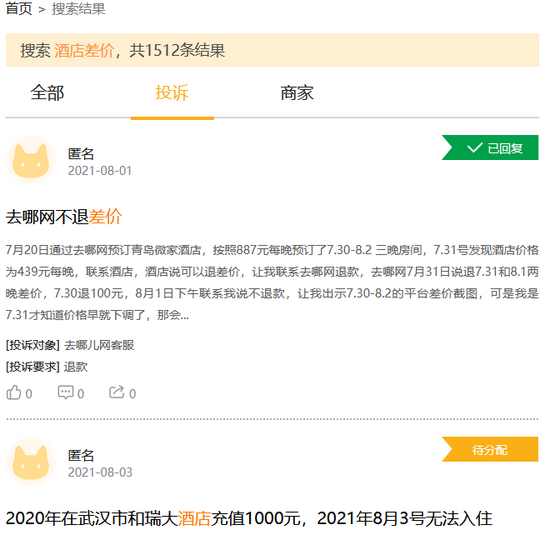 ▲ 投诉平台上,几乎每天都会有几条关于在平台上订酒店有差价的投诉内容。图 / 网页截图