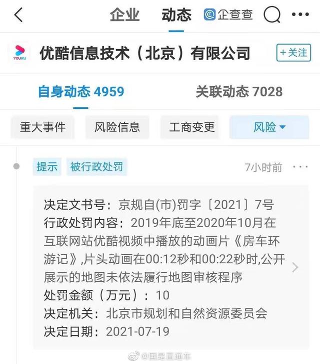 商业 优酷播放动画片地图未履行审核程序:被罚10万 2021-08-05 11:26:29 分享 来源:新浪财经信息显示,近日,优酷信息技术(北京)有限公司新增一条行政处罚。因在优酷视频播放的动画片片头公开展示的地图未依法履行地图审核程序,被罚款10万元。处罚单位为北京规划和自然资源委员会。
