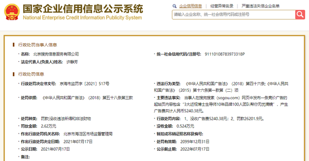 商业 搜狗发布竞价广告被罚:已多次违反广告法 2021-08-06 10:46:35 分享 来源:新浪科技8月5日下午消息,国家企业信用信息系统显示,近日,北京搜狗信息服务有限公司新增一条行政处罚信息。违法行为类型为违反广告法,当事人在搜狗搜索网页中发布一条竞价广告的起始页内容包含“3大近视博士生导师10年品牌100人团队帮你无忧摘镜”,产生广告费共计人民币5240.38元。对此,搜狗被处没收广告费和罚款26201.9元的行政处罚。2020年3月至今,北京搜狗信息服务有限公司已被行政处罚九次,违法行为类型均为违反广告法。