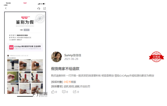 根据黑猫投诉平台上Sunny佳佳的描述,Sunny佳佳在小红书官方购买了迪奥888色款系列,但是根据美妆鉴定软件心心APP,迪奥888口红色号为假货。