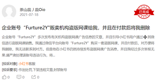 例如在黑猫投诉中,有用户投诉小红书企业账号“FURTURE2Y”在小红书贩卖机构盗版网课,并且在数据维护和文案代写后直接删除了付款用户。
