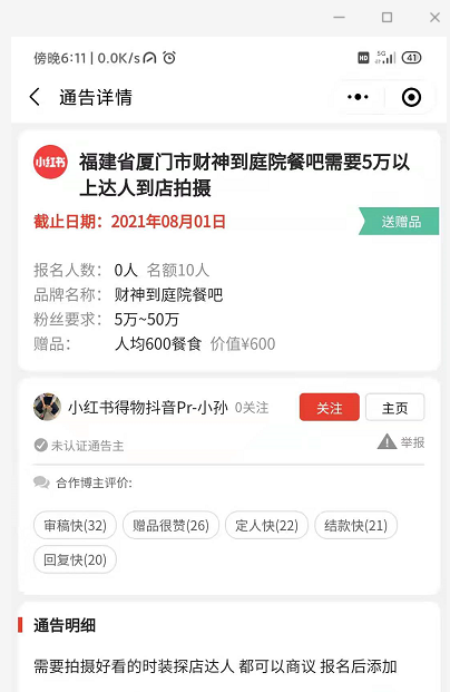 例如在福建省厦门市财神到庭院餐吧需要5万—50万粉丝以上达人拍摄小红书内容,拍摄小红书的赠品则是600元的餐食。