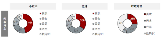 根据头豹数据中小红书的美妆最大占比46%,微博的美妆占比为35%,而哔哩哔哩的数码3C占比41%,美妆占比为26%。