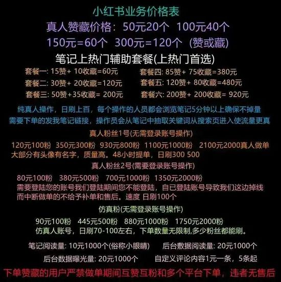 小红书推广商家每日在朋友圈发放小红书业务价格表,真人点赞价格50元20个,仿真粉丝90元100个,真人粉丝120元100个,笔记浏览量上10元1000个浏览。