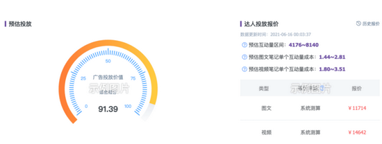 例如在小红书博主都市妖怪生存指南的投放中,千瓜数据预估投放评分91.39,根据千瓜数据测算,都市妖怪生存指南的一条推广预估互动量区间在4160—8140之间,单个笔记图文的互动成本在1.44—2.81之间,视频的单个互动价格比图文要高出不少预估单价在1.8—3.51之间。