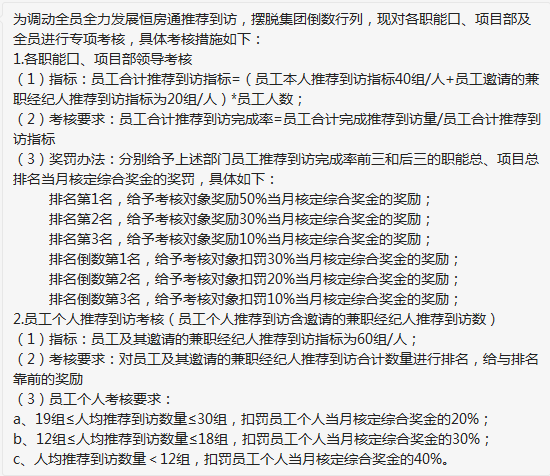 恒大的工资分为基础工资和绩效两部分,并分两次发放,分别是次月5号和20号,5号发薪水的一半,也就是基本工资,20号以后发的则是奖金,如果完不成指标则扣奖金,这些指标包括不限于早晨打卡、拉储任务、到访人数考核等。