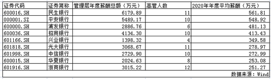 值得注意的是,民生银行高管的薪酬仍领先同业。据Wind数据显示,近三年民生银行管理层年度薪酬总额均居于上市股份行首位。2018年为8180万,2019年为6436万,2020年为6179万。