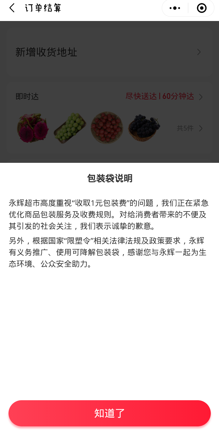 《炣燃科技》查询微信小程序“YH永辉生活+”发现,其首页通知栏中新增添了《商品包装服务及收费规则优化中》。此外,截至《炣燃科技》发稿,在此小程序中结算时,包装费显示为1元,其说明处显示:永辉超市高度重视“收取1元包装费”的问题,我们正在紧急优化商品包装服务及收费规则。对给消费者带来的不便及其引发的社会关注,我们表示诚挚的歉意。另外,根据国家“限塑令”相关法律法规及政策要求,永辉有义务推广、使用可降解包装袋,感谢您与永辉一起为生态环境、公众安全助力。