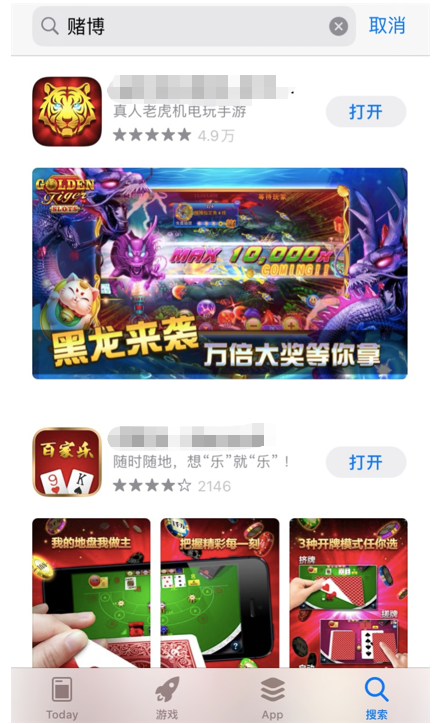 “同城约*”“附近约*”“**老虎机”“**赌场”……一些涉黄、涉赌、涉不法游戏的App就公然出现在苹果应用商店里!用户轻易就可搜到、下载,进而接触到有害信息。