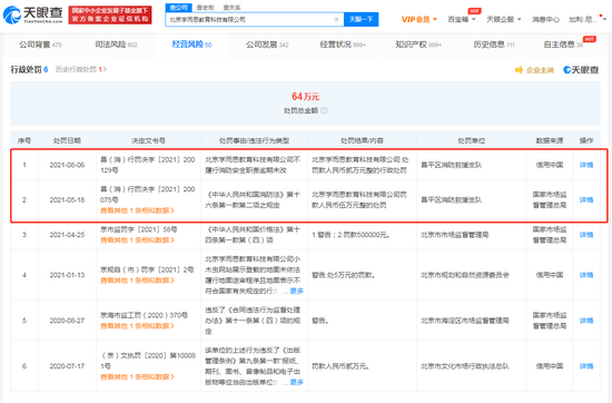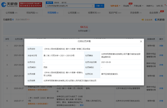 商业 学而思因不履行消防安全职责被罚2万:5月因违反消防法就曾被罚 2021-08-11 14:00:11 分享 来源:新浪财经天眼查App显示,近日,北京学而思教育科技有限公司因不履行消防安全职责逾期未改被罚款2万元,案号昌(消)行罚决字〔2021〕200129号,处罚单位为昌平区消防救援支队。值得一提的是,该公司今年5月因违反消防法,被昌平区消防救援支队罚款5万元。