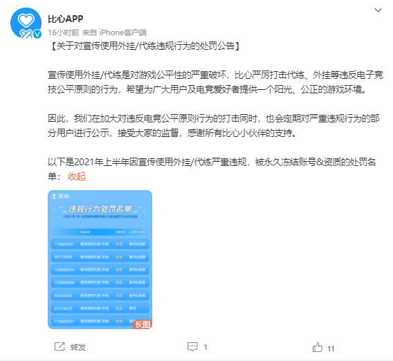 炣燃科技8月11日讯(李琳)昨晚,比心APP通过官方微博发布了《关于对宣传使用外挂/代练违规行为的处罚公告》,并附上了2021年上半年因宣传使用外挂/代练严重违规,被永久冻结账号&资质的处罚名单。