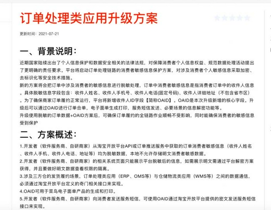 7月21日,淘宝更新“订单敏感信息保护”的应用升级方案,包括“订单处理类”和“仓储物流类”,称将启动订单处理链路的消费者敏感信息保护方案,对涉及消费者个人敏感信息采取加密等安全技术措施。