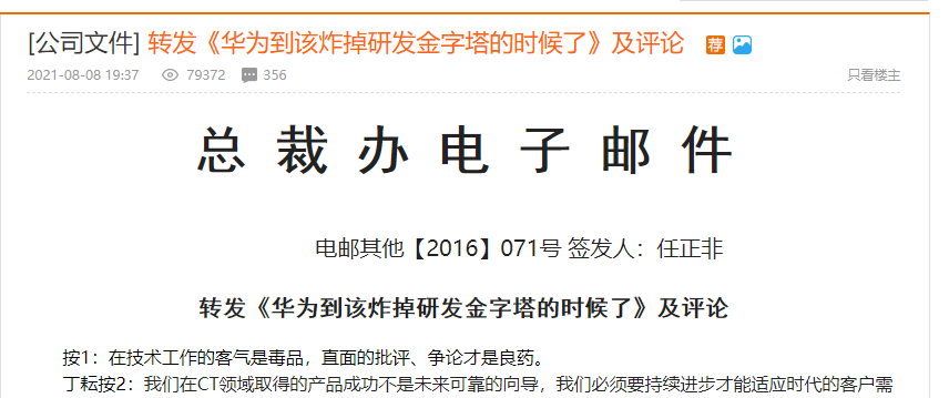 邮件显示,《华为到该炸掉研发金字塔的时候了》作者是署名为泥瓦客的华为员工,该篇文章是其关于华为公司软件研发效率与质量提升的思考。任正非签发的这篇文章报送华为董事会成员、监事会成员,主送华为全体员工。邮件签发时间为2016年8月5日。2021年8月8日,华为时隔5年再次转发这一文章。