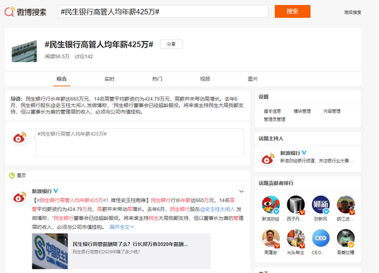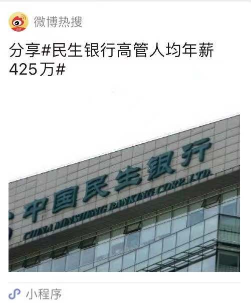 近日,#民生银行(4.040,0.00,0.00%)高管人均年薪425万#话题上热搜。