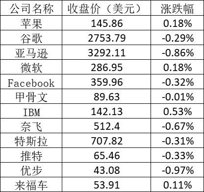 大型科技股多数下跌,谷歌、亚马逊、Facebook和奈飞股价均下跌,但跌幅均不超过1%;苹果和微软股价上涨,但涨幅不超过1%。