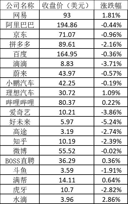 其它热门中概股涨跌不一,其中满帮上涨0.64%,BOSS直聘上涨0.36%,哔哩哔哩上涨0.22%,滴滴下跌3.71%,知乎下跌2.39%,斗鱼下跌1.91%,百度下跌0.36%。