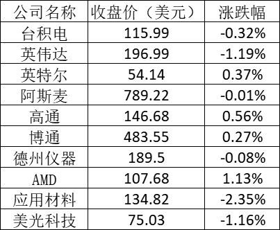 美股中的主要芯片股表现如下: