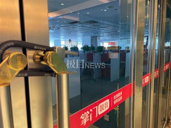 8月12日,极目新闻记者乘电梯到达银座大厦C座,上到所在楼层,一出电梯就看到,两个被遗弃的“掌门在线一对一”易拉宝映入眼帘,随之进入视野的则是南北两侧办公区紧锁的玻璃门。掌门教育之前承租了整个层楼,南北两个办公区,如今两侧的门上各加了一把大锁,门玻璃上还贴着“关于因欠费限制经营的通知函”,署名是济南某置业公司。