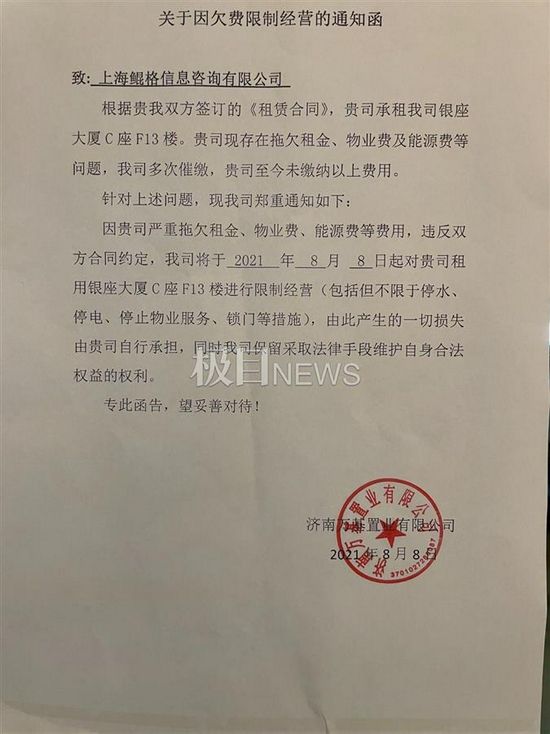 记者看到,通知函上写道,“掌门教育济南分部办公场地的承租方上海鲲格信息咨询有限公司,因严重拖欠租金、物业费、能源费等费用,被出租方采取了限制经营措施。”