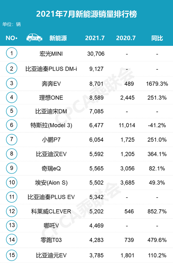 根据乘联会公布了新能源汽车销量榜显示,7月份仅宏光MINIEV一款车型超过万辆,为30,706辆,而此前持续排名第二 Model 3被比亚迪秦PLUS DM-i反超,为9,127辆,Model 3以6,477辆的月销成绩排名第六,而Model Y更是跌出新能源榜单,被零跑T03、哪吒V等车型反超。