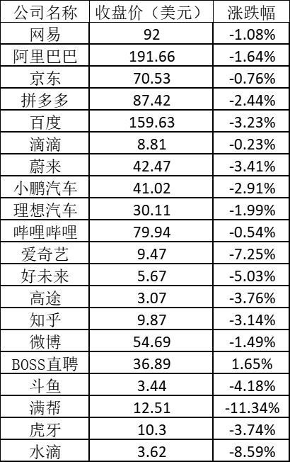 其它热门中概股普遍下跌,其中满帮下跌11.34%,斗鱼下跌4.18%,百度下跌3.23%,知乎下跌3.14%,哔哩哔哩下跌0.54%,滴滴下跌0.23%,BOSS直聘上涨1.65%。