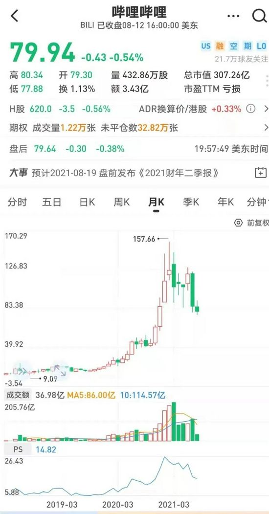 今年3月,B站二次上市登陆港股,彼时B站美股刚创新高,价格接近160美元一股,市值一度超过530亿美元。高光之后,B站的股价没能再给投资者带来惊喜,目前B站美股股价在80美元左右,港股股价600港元出头,都距离最高点下去至少40%。
