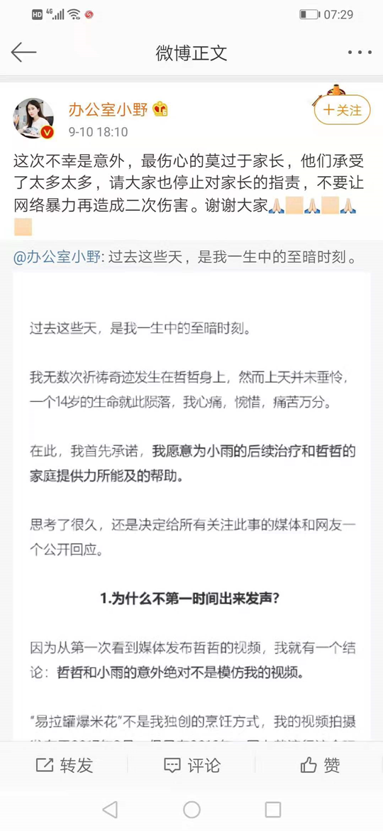 9月10日,“办公室小野”首次在其官方微博上回应,称“过去这些天,是我一生中的至暗时刻”、“俩少女的不是模仿我的视频”。