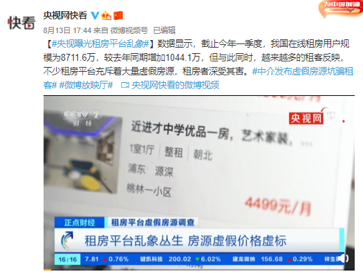 商业 央视曝光租房平台乱象:安居客被曝充斥虚假房源 2021-08-14 09:34:58 分享 来源:央视新闻数据显示,截止今年一季度,我国在线租房用户规模为8711.6万,较去年同期增加1044.1万,但与此同时,越来越多的租客反映,不少租房平台充斥着大量虚假房源,租房者深受其害。
