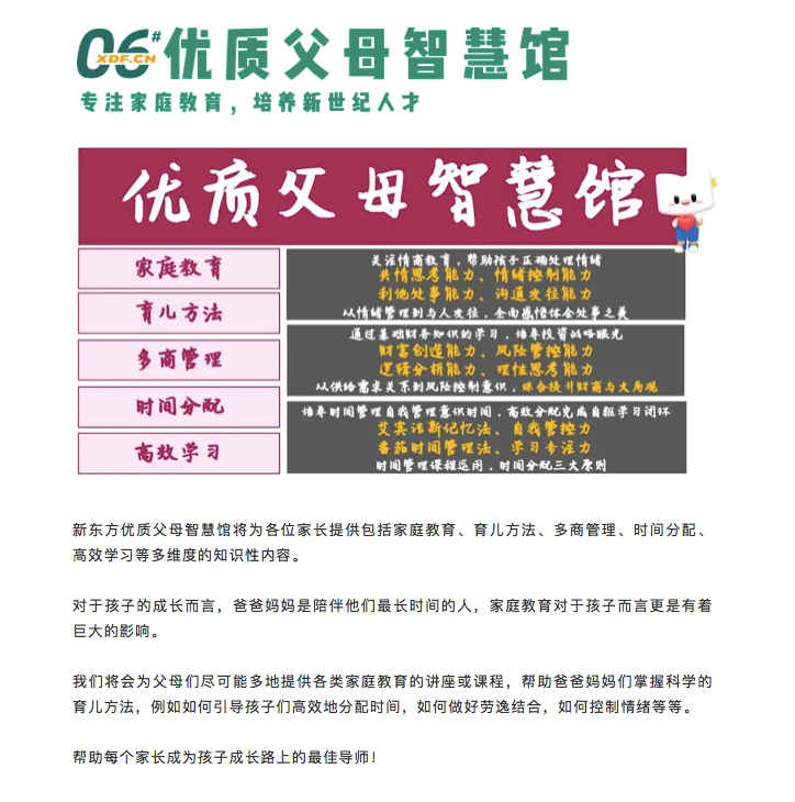 文章称,新东方优质父母智慧馆将为各位家长提供包括家庭教育、育儿方法、多商管理、时间分配、高效学习等多维度的知识性内容。