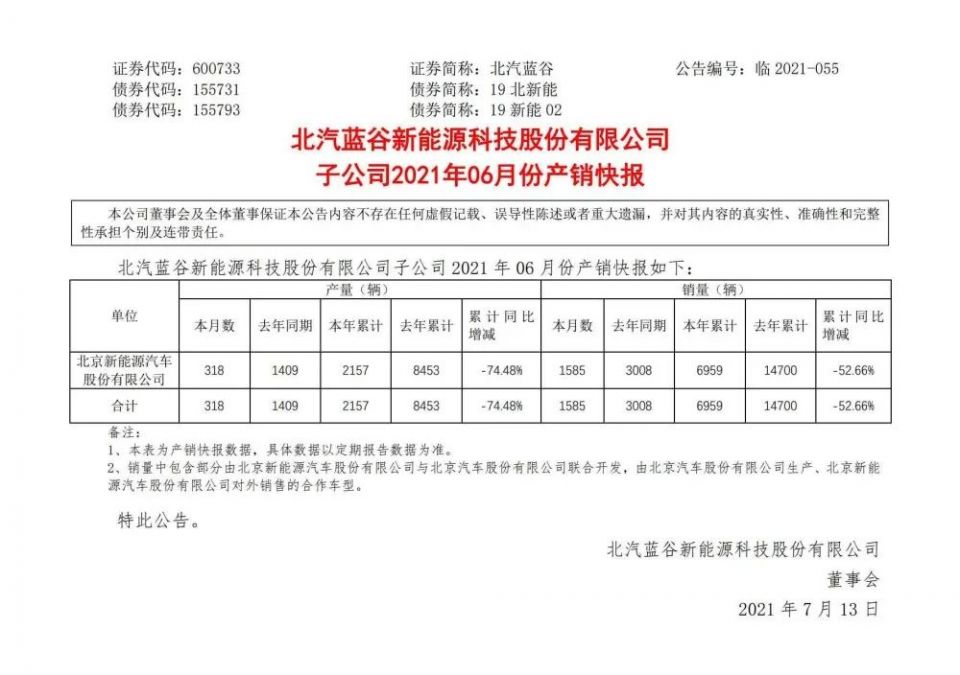 ▲2021年6月北汽新能源产销快报(来源:北汽新能源官方公告)