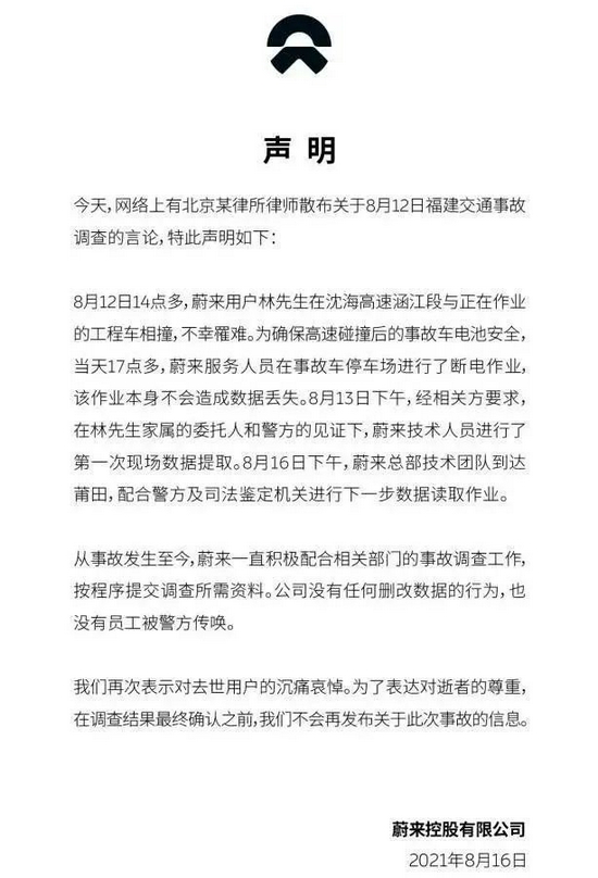 蔚来汽车在声明中描述称,8月12日14点多,蔚来用户林先生在沈海高速涵江段与正在作业的工程车相撞,不幸罹难。为确保高速碰撞后的事故车电池安全,当天17点多,蔚来服务人员在事故车停车场进行了断电作业,该作业本身不会造成数据丢失。