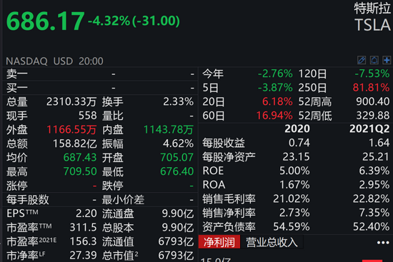 受被调查消息的影响,16日晚间,美股开盘后,特斯拉股价直线跳水,报收686.17美元/股,跌幅达4.32%,市值蒸发近350亿美元。