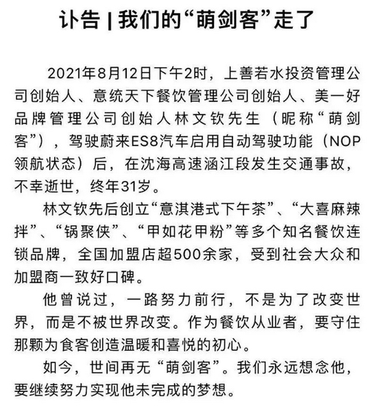 此前在8月14日晚间,餐饮品牌管理“美一好”微信号发布讣告称,8月12日下午2时,美一好品牌管理公司创始人林文钦,驾驶蔚来ES8汽车启用自动驾驶功能(NOP领航状态)后,在沈海高速涵江段发生交通事故,不幸逝世,终年31岁。