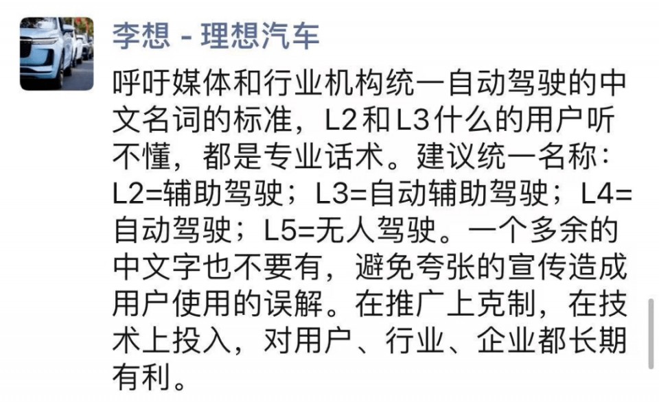 8月16日,理想汽车创始人李想就在朋友圈发文,呼吁媒体和行业机构统一自动驾驶的中文名词的标准,L2=辅助驾驶;L3=自动辅助驾驶;L4=自动驾驶;L5=无人驾驶。一个多余的中文字也不有,避免夸张的宣传造成用户使用的误解。并提出,“在推广上克制,在技术上投入,对用户、行业、企业都长期有利。”