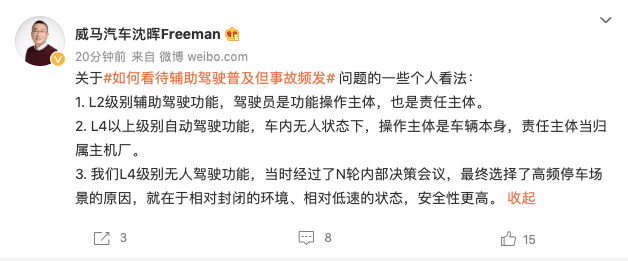 此外,在新浪微博的“辅助驾驶普及但是事故频发”话题下,威马汽车创始人、董事长兼CEO沈晖也刷起存在感,他在提出“三点个人意见”的同时,不忘强调自家“L4级别无人驾驶功能”的稳健。