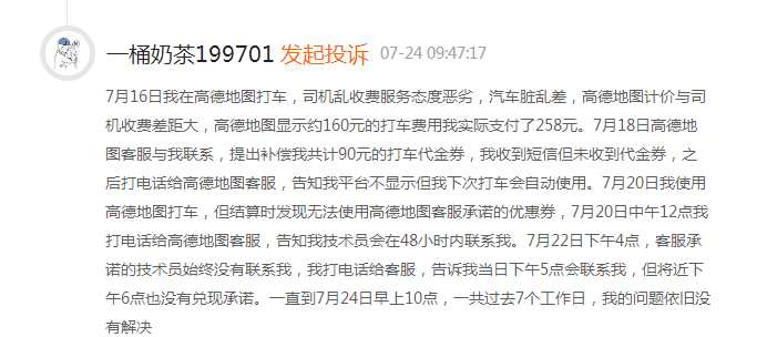 另有消费者在黑猫投诉高德打车称,司机乱收费服务态度恶劣,汽车脏乱差,高德地图计价与司机收费差距大,高德地图显示约160元的打车费用实际支付了258元。经过沟通后平台答应补偿的价值90元优惠券也是迟迟未能兑现。