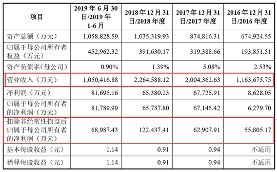 财务数据来看,2016年、2017年、2018年、2019年上半年,公司分别实现营收116.37亿元、200.44亿元、226.46亿元和105.04亿元;净利润分别为5.58亿元、6.29亿元、12.24亿元和6.90亿元。
