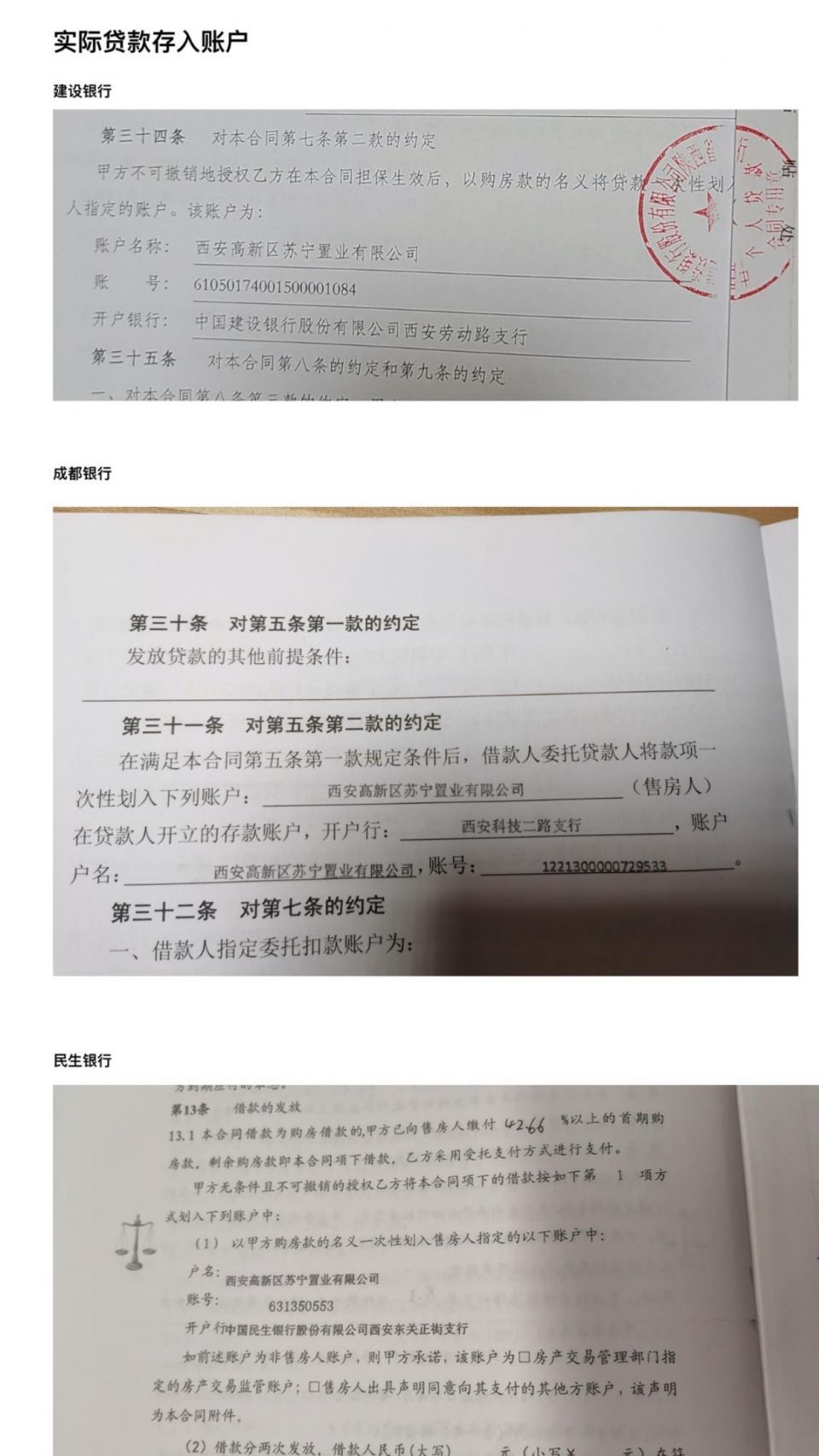 李先生表示,目前,有超过900户业主反映前述问题。他提供的部分业主和银行签订的贷款合同截图显示,售房人账户名为西安高新区苏宁置业有限公司,