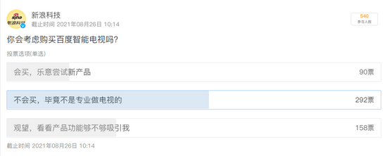 据新浪科技发起的用户调研数据显示,在540余名被调研人员反馈信息中,有近54.2%的反馈者明确表示不认可百度智能电视的专业能力,同时表态不会购买百度智能电视;另外有29.2%的消费者持观望态度,需要进一步研究产品的功能细节;表示愿意尝试的消费者仅占16.6%。