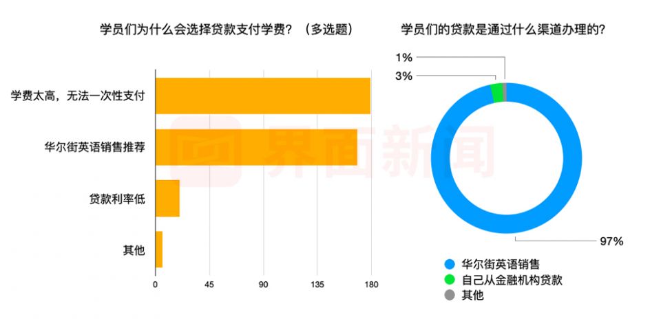 229份贷款学员的有效问卷调查结果显示,“学费太高、无法一次性支付”和“华尔街英语销售推荐”是学员选择贷款上课的两大最重要原因,并有相当比例学员同时选择。而在渠道方面,有高达97%的学员都是通过华尔街英语销售办理贷款。