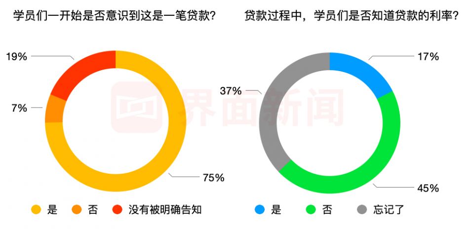 以此次贷款学员调查问卷结果为例,数据显示,有约25%的学员没有明确意识到自己在办理贷款,并且仅约17%的学员知道贷款利率。