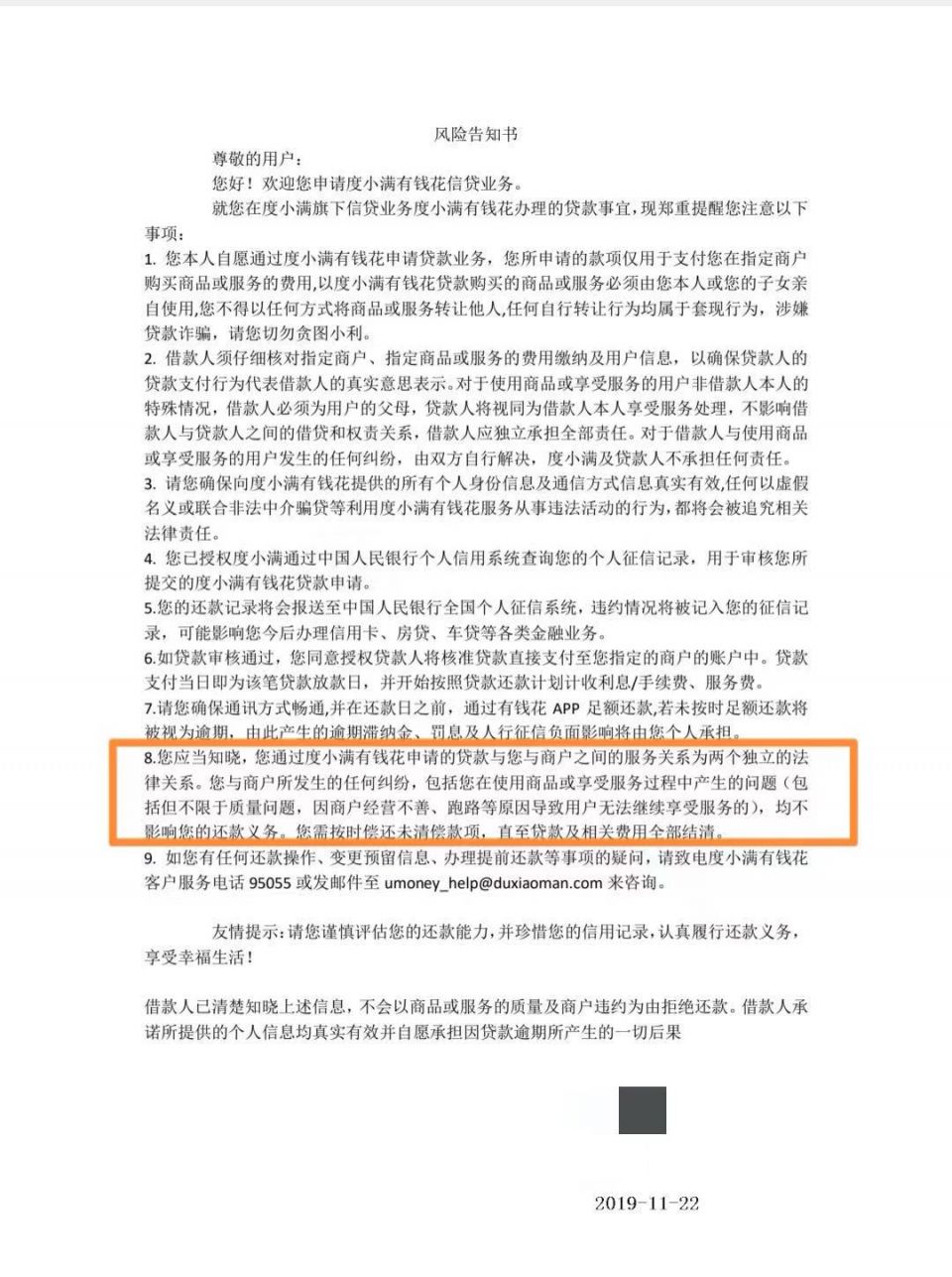 多位学员向界面新闻展示了来自度小满的风险告知书,其中均有条款提出,“借款人与贷款人之间的借贷和权责关系,借款人应独立承担全部责任,贷款生效后,对于借款人与使用商品或享受服务的用户之间发生的任何纠纷,由双方自行解决,度小满及贷款人不承担任何责任”。但学员也指出,在签署这份风险告知书之际,销售人员并未向其进行过详细介绍与警示。