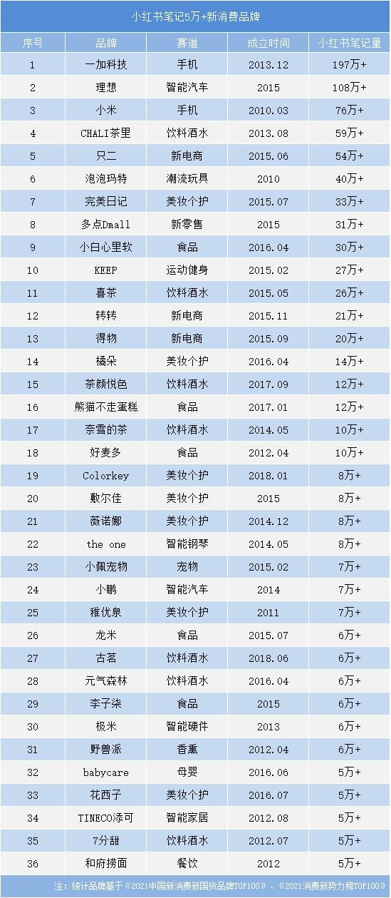 因此,以年轻女性为受众群体的新消费品牌更愿意将小红书作为品牌推广投放平台。盒饭财经结合《2021中国新消费新国货品牌TOP100》《2021消费新势力榜TOP100》整理了小红书上笔记在5W+的新锐品牌,其中包括潮流玩具头部品牌泡泡玛特、新晋美妆国货品牌完美日记、长沙限定网红茶饮茶颜悦色等。